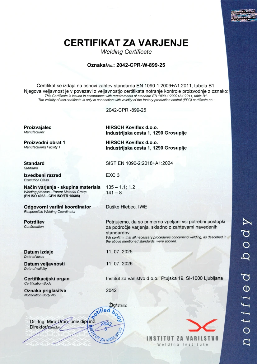 Die HIRSCH Koviflex d.o.o. ist zertifiziert nach AD 2000-Merkblatt HP 0 (2024-08) sowie EN 13445-4:2021+A1:2023 in Verbindung mit EN ISO 3834-3:2021 und erfüllt damit höchste Anforderungen im Bereich der Herstellung von Druckgeräten.