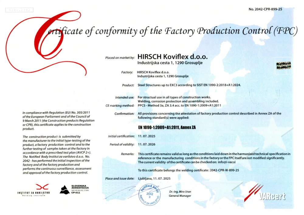 Podjetje HIRSCH Koviflex d.o.o. izpolnjuje vse zahteve evropske zakonodaje za proizvodnjo jeklenih konstrukcij. Certificirani smo skladno s standardoma:
